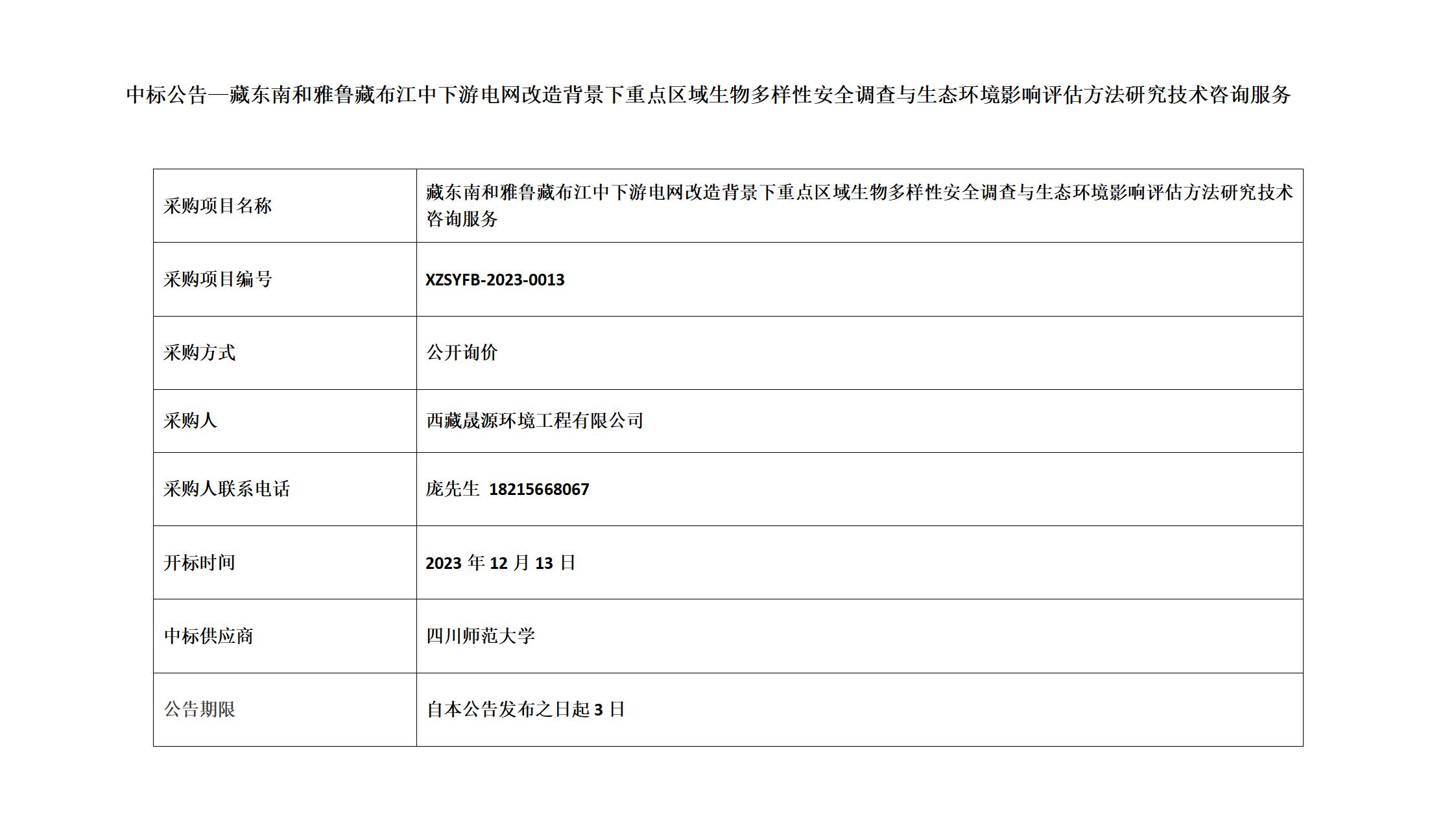 中标公告—藏东南和雅鲁藏布江中下游电网改造背景下重点区域生物多样性安全调查与生态环境影响评估方法研究技术咨询服务