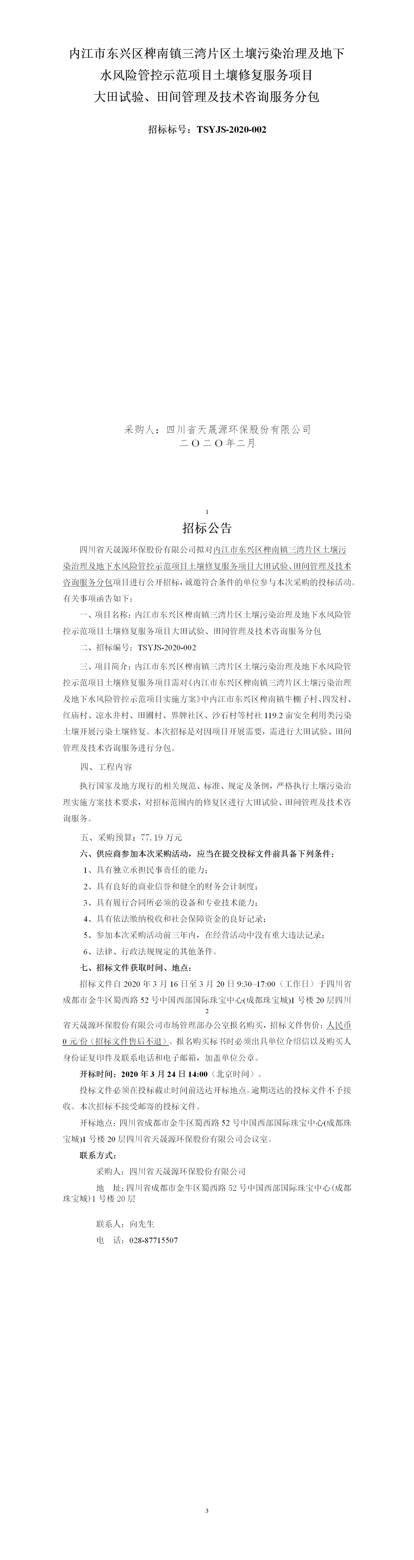 内江市东兴区椑南镇三湾片区土壤污染治理及地下水风险管控示范项目土壤修复服务项目 大田试验、田间管理及技术咨询服务分包 招标标号:TSYJS-2020-002