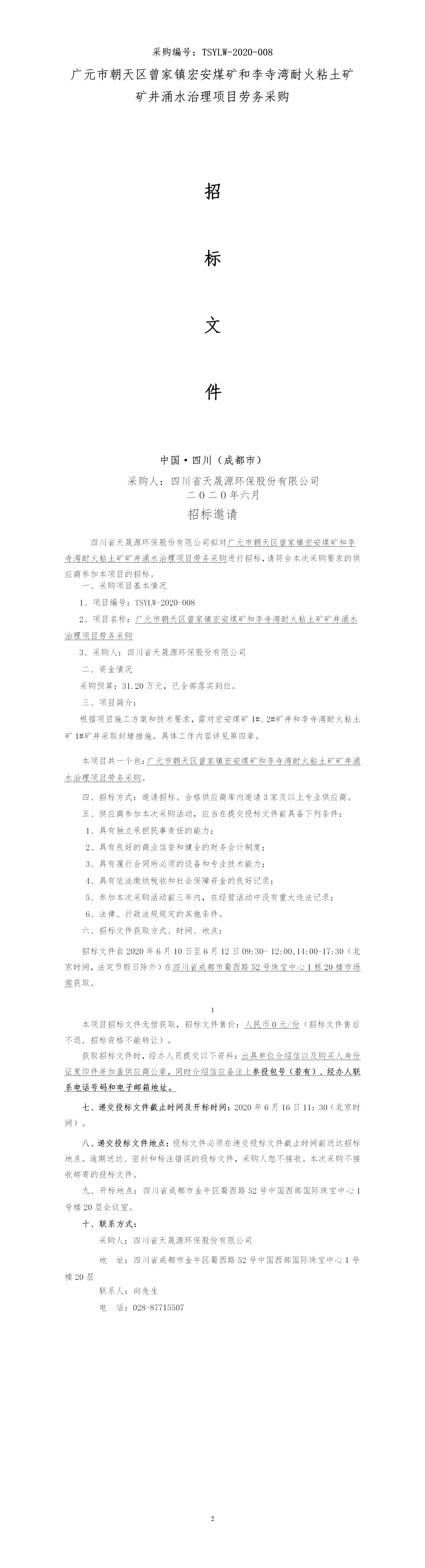 采购编号:TSYLW-2020-008 广元市朝天区曾家镇宏安煤矿和李寺湾耐火粘土矿矿井涌水治理项目劳务采购