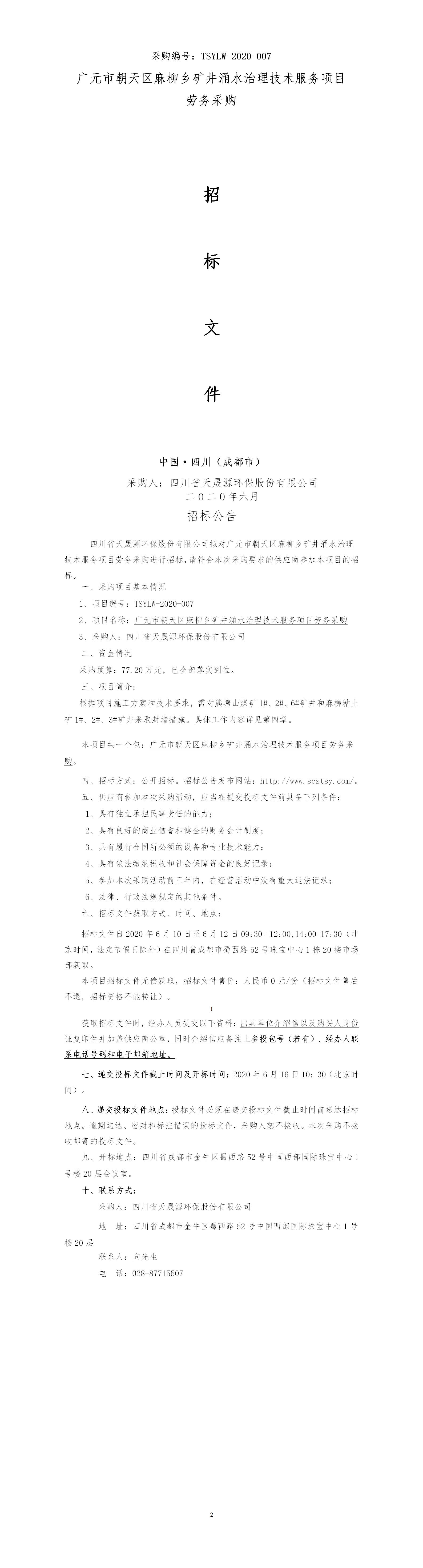 采购编号:TSYLW-2020-007 广元市朝天区麻柳乡矿井涌水治理技术服务项目 劳务采购