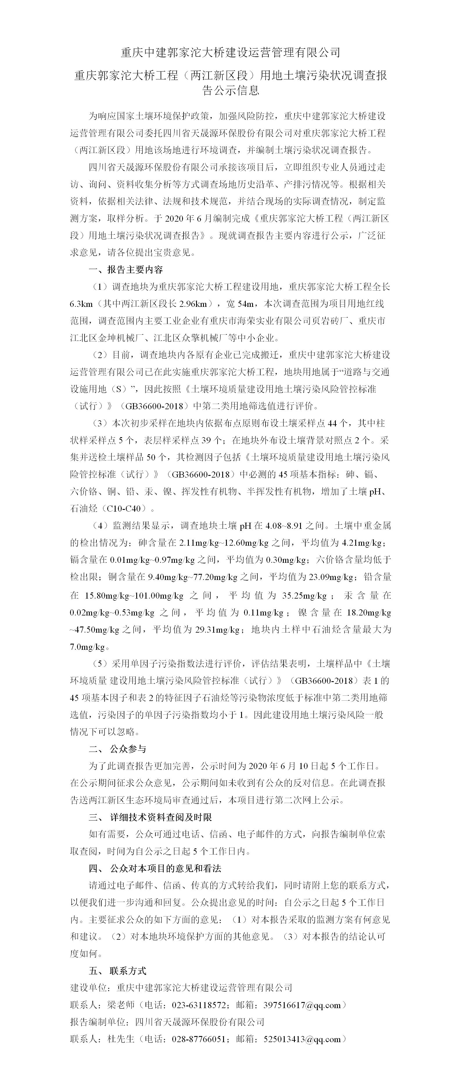 重庆中建郭家沱大桥建设运营管理有限公司 重庆郭家沱大桥工程(两江新区段)用地土壤污染状况调查报告公示信息