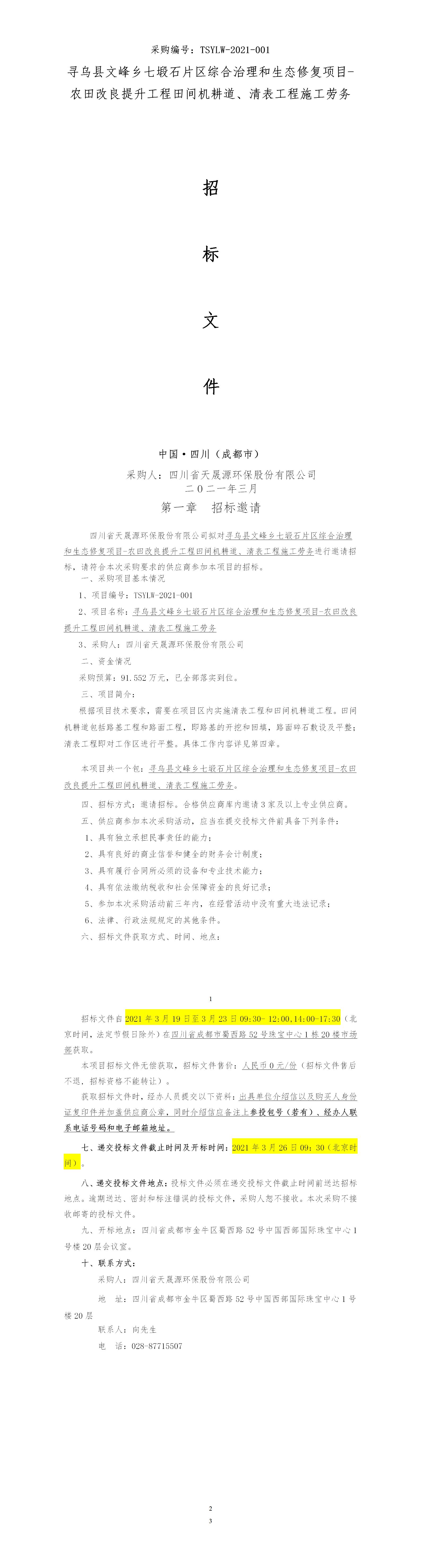 采购编号:TSYLW-2021-001 寻乌县文峰乡七塅石片区综合治理和生态修复项目-农田改良提升工程田间机耕道、清表工程施工劳务招标文件