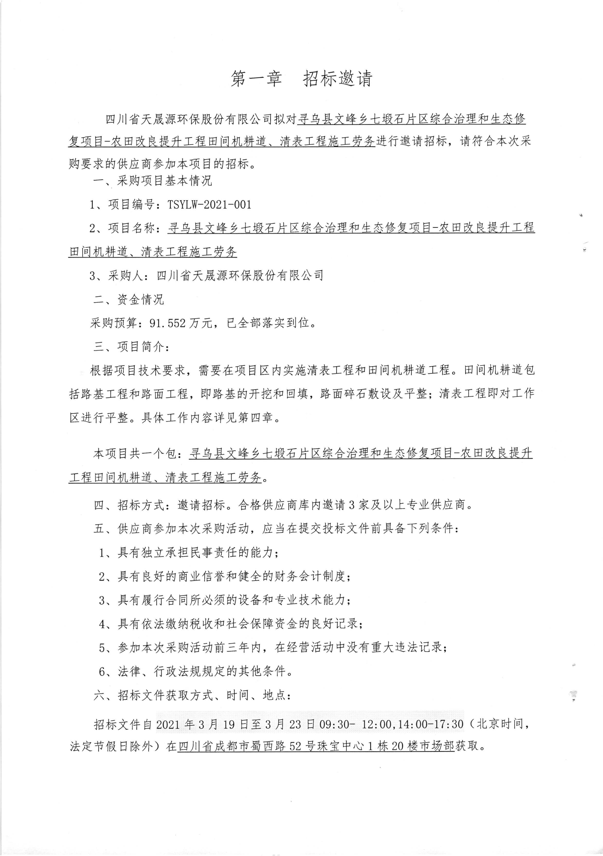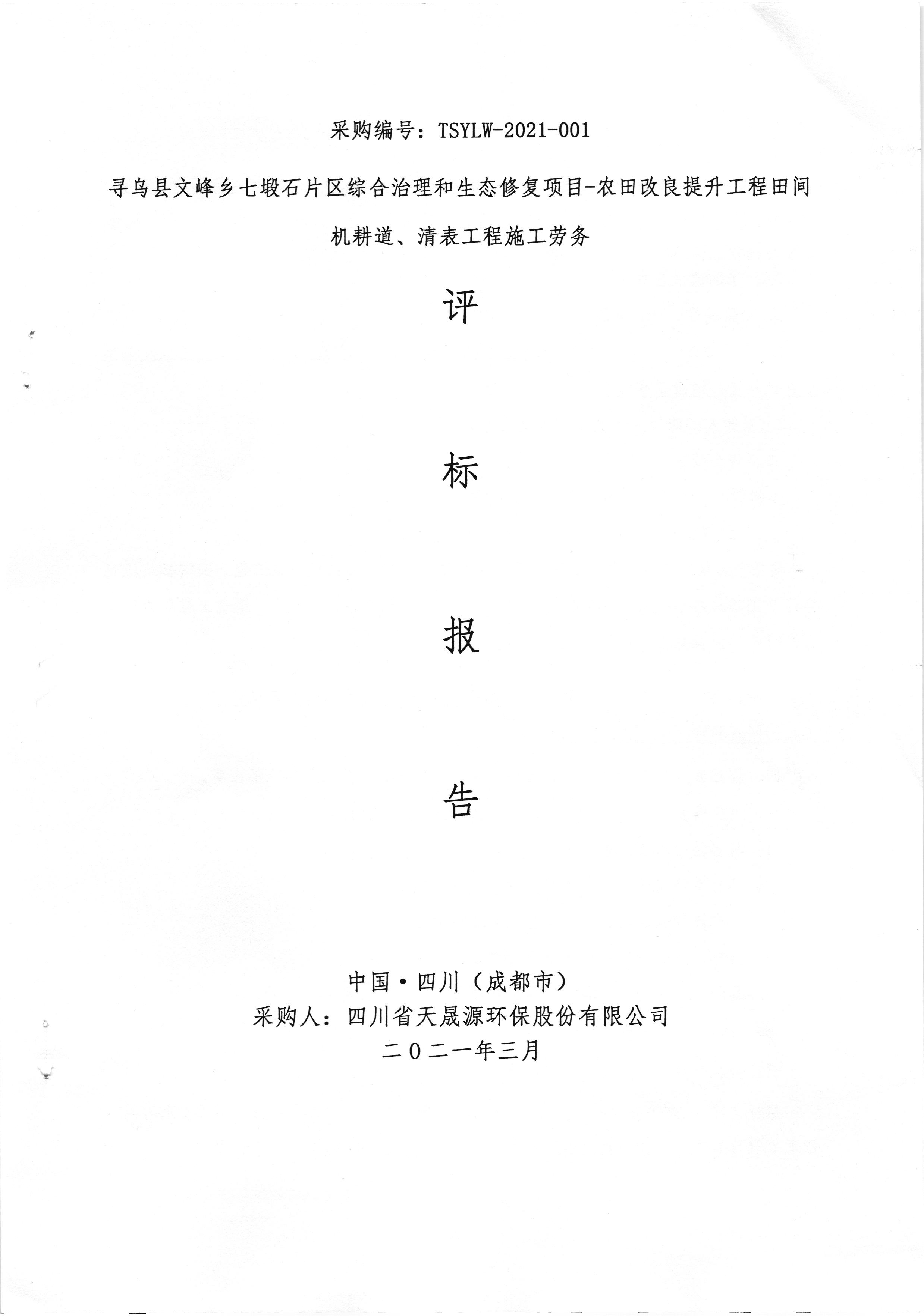 TSYLW-2021-001寻乌县文峰乡七塅石片区综合治理和生态修复项目-农田改良提升工程田间机耕道、清表工程施工劳务中标公告