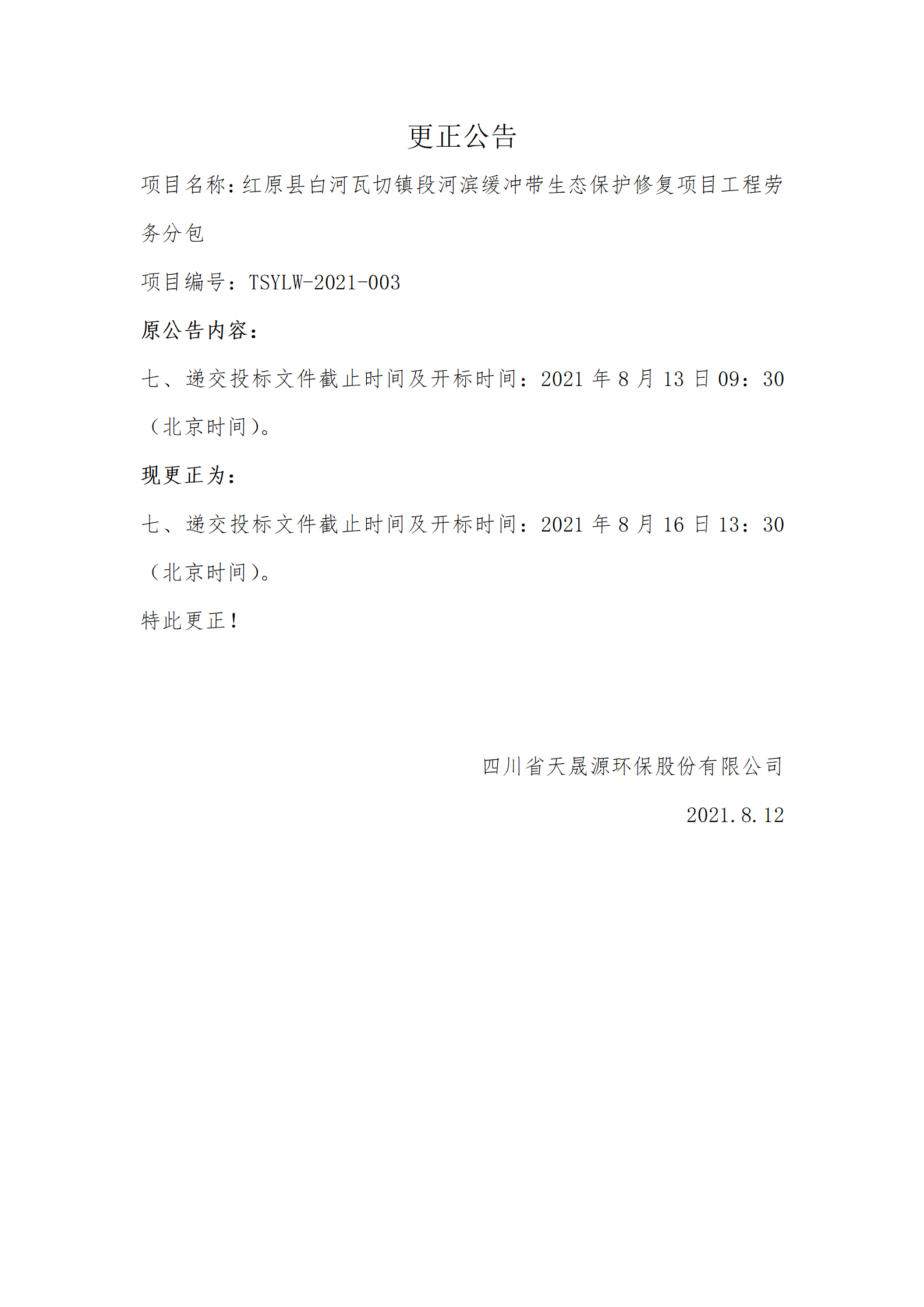 更正公告——红原县白河瓦切镇段河滨缓冲带生态保护修复项目工程劳务分包
