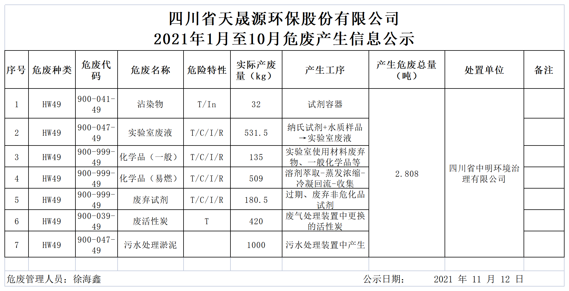 火狐(中国)官方网站-登录入口2021年1月至10月危废产生信息公示