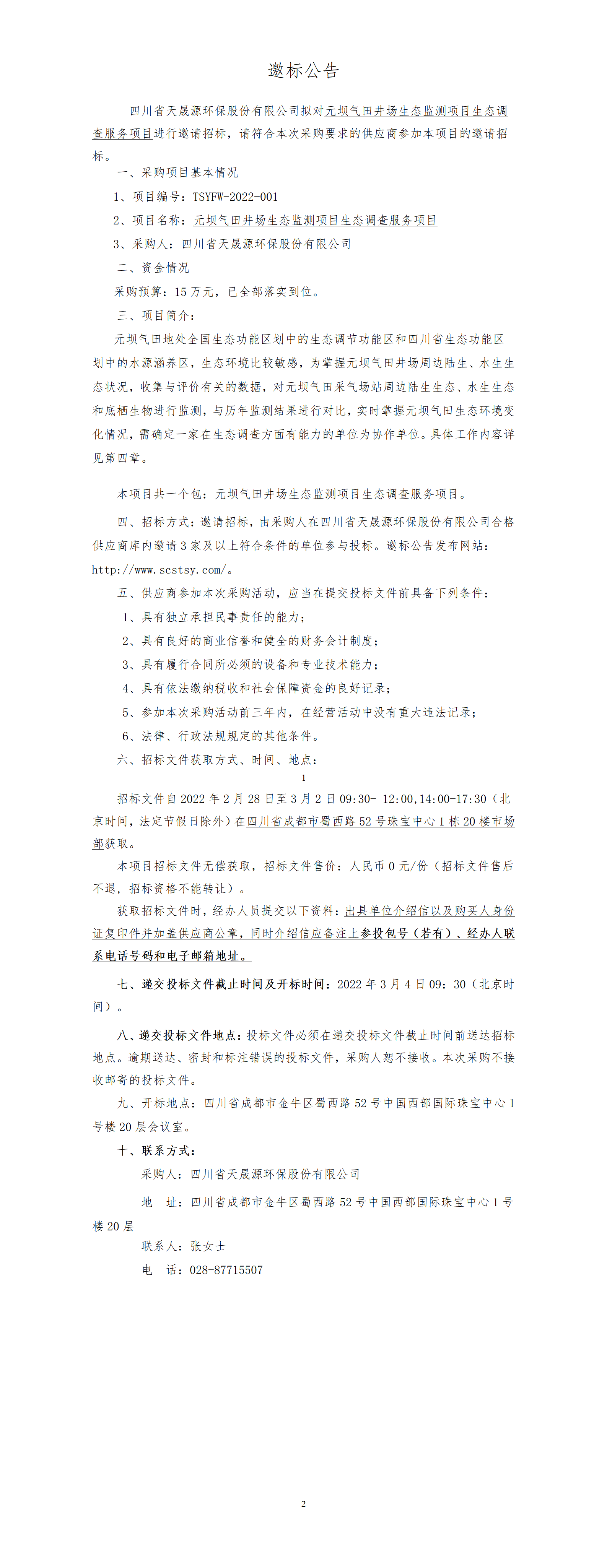 TSYFW-2022-001 元坝气田井场生态监测项目生态调查服务项目-邀请公告