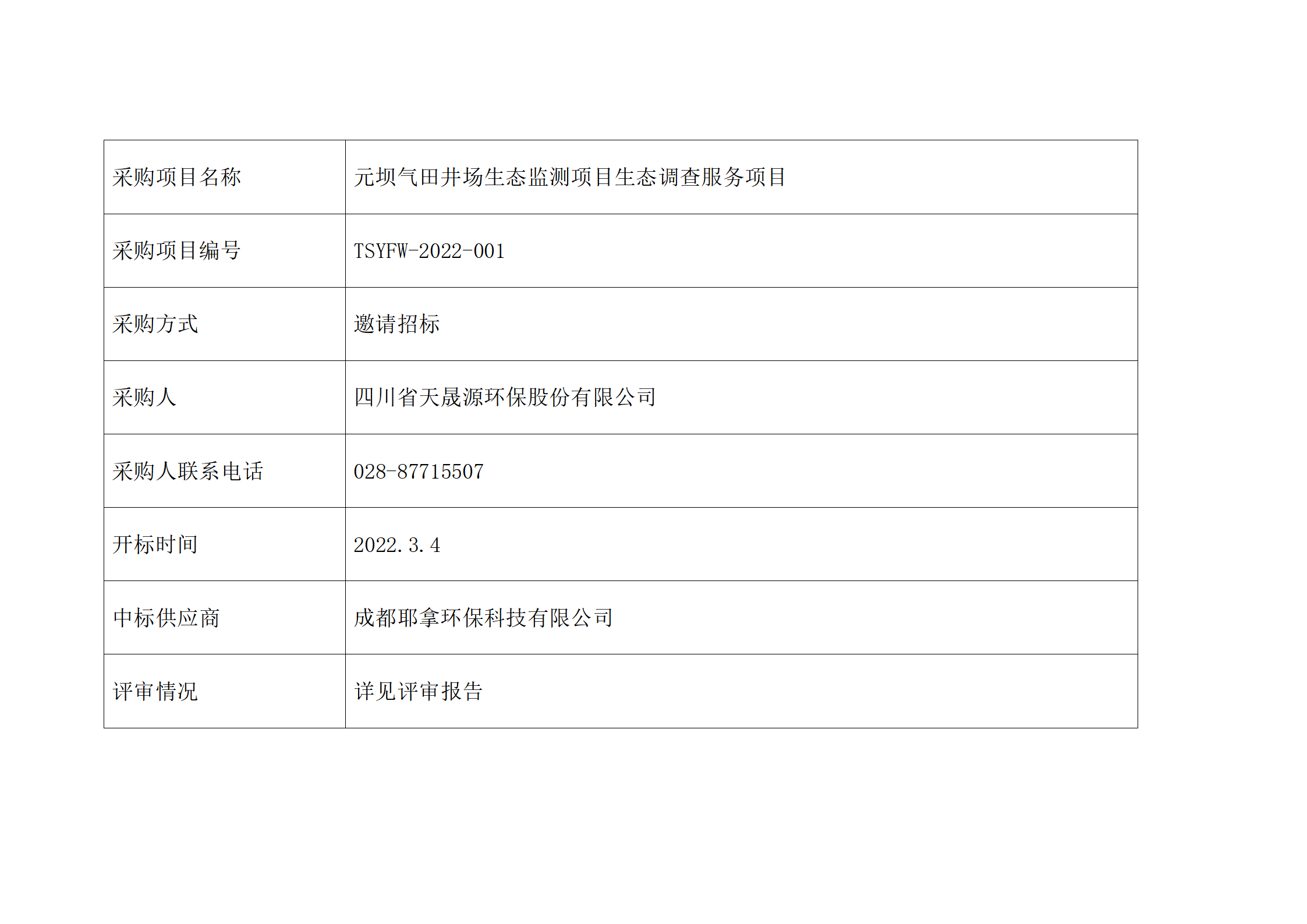 元坝气田井场生态监测项目生态调查服务项目招标结果公示表