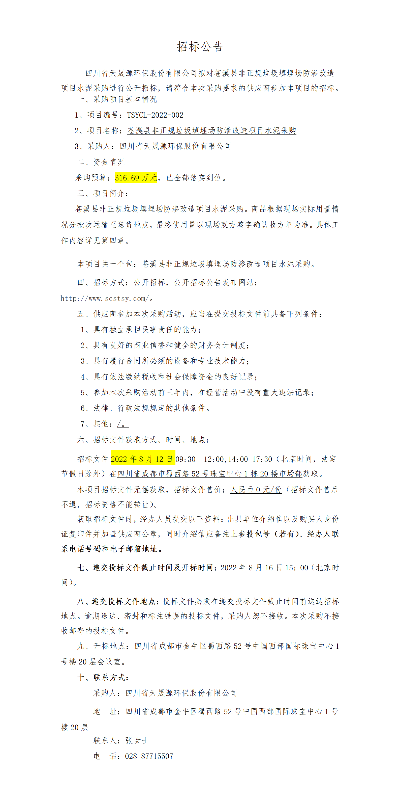招标公告-TSYCL-2022-002 苍溪县非正规垃圾填埋场防渗改造项目水泥采购