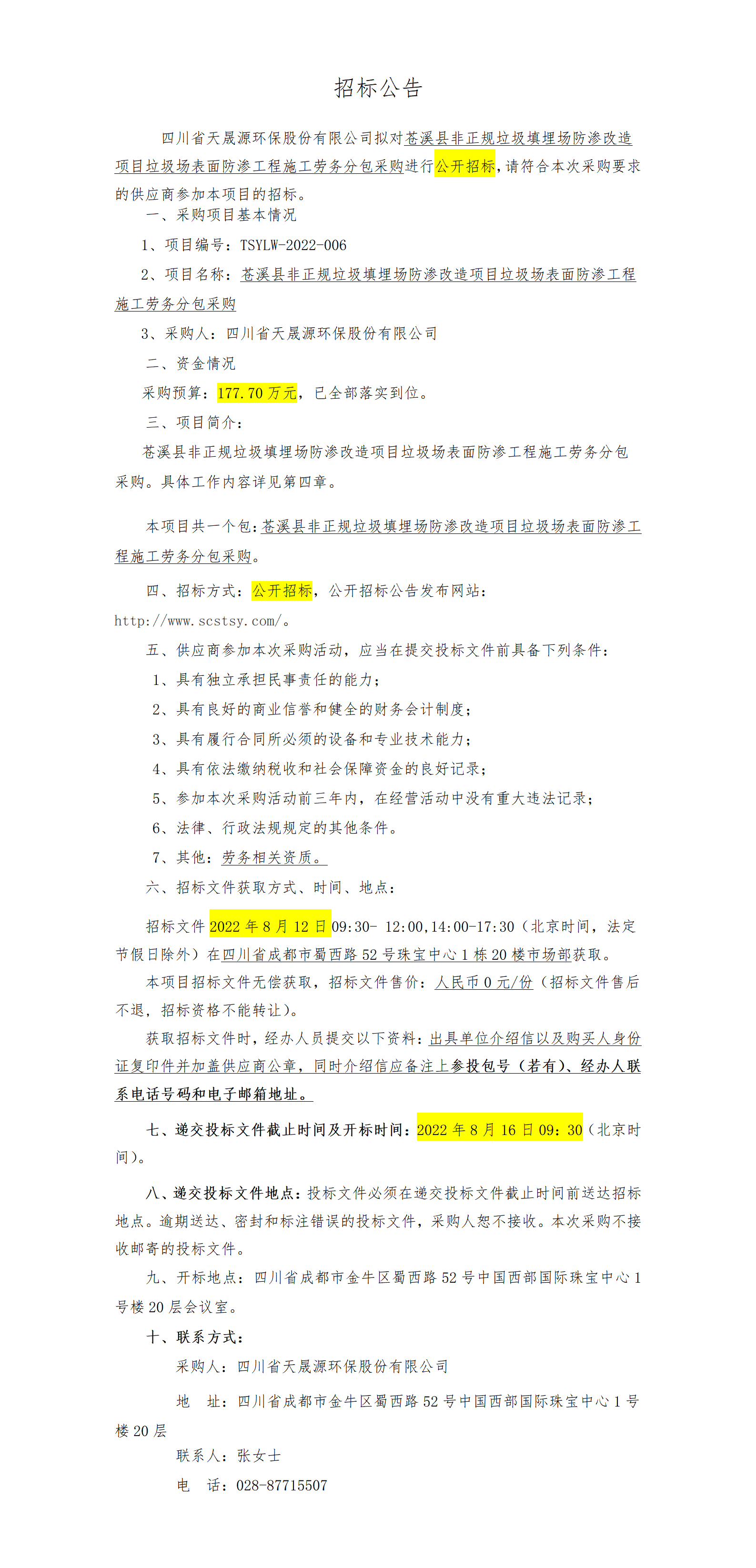 招标公告-TSYLW-2022-006 苍溪县非正规垃圾填埋场防渗改造项目垃圾场表面防渗工程施工劳务分包采购