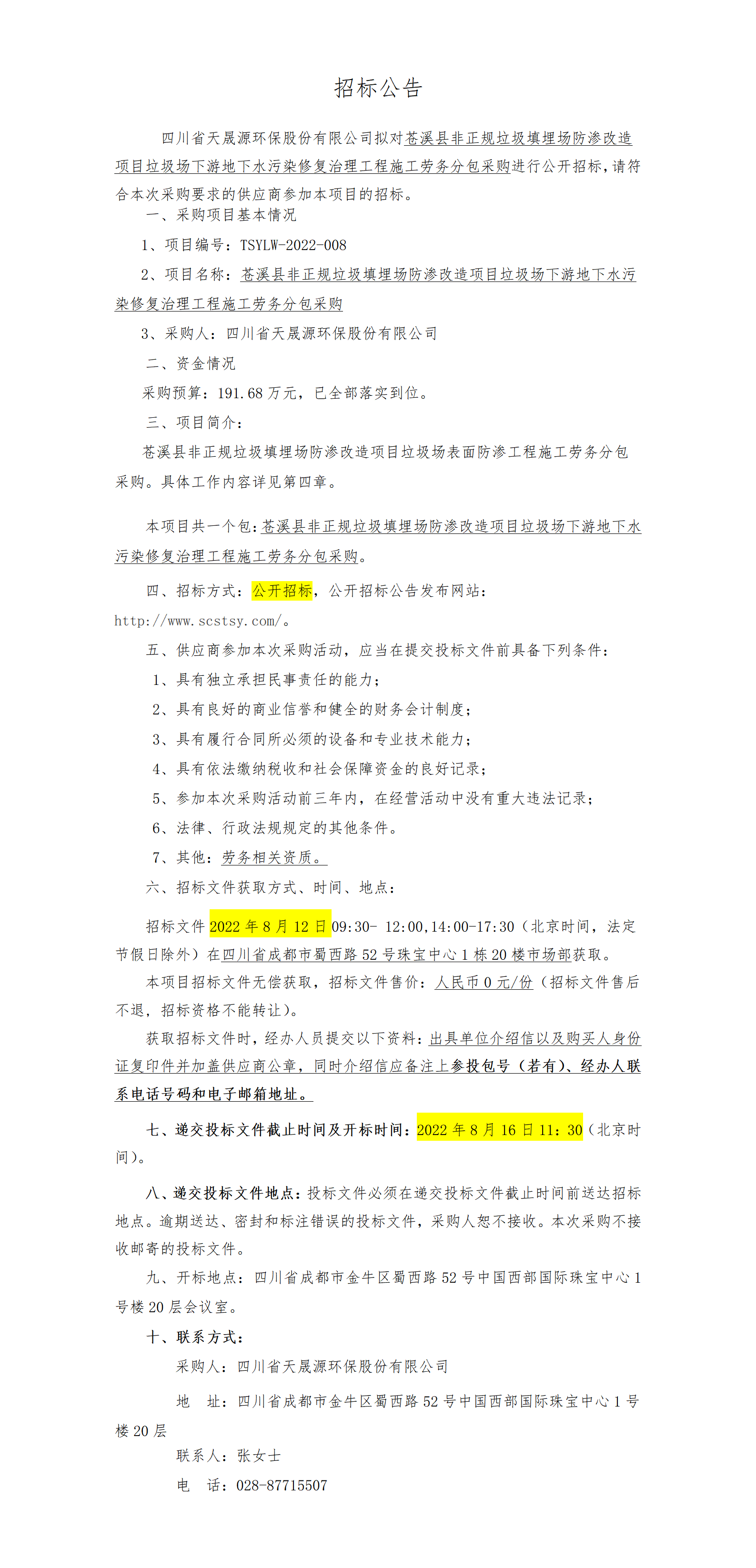 招标公告-TSYLW-2022-008 苍溪县非正规垃圾填埋场防渗改造项目垃圾场下游地下水污染修复治理工程施工劳务分包采购