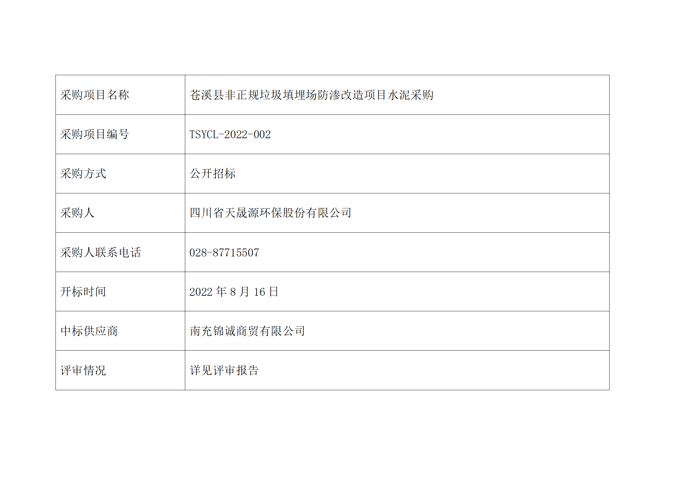 中标公告-苍溪县非正规垃圾填埋场防渗改造项目水泥采购TSYCL-2022-002