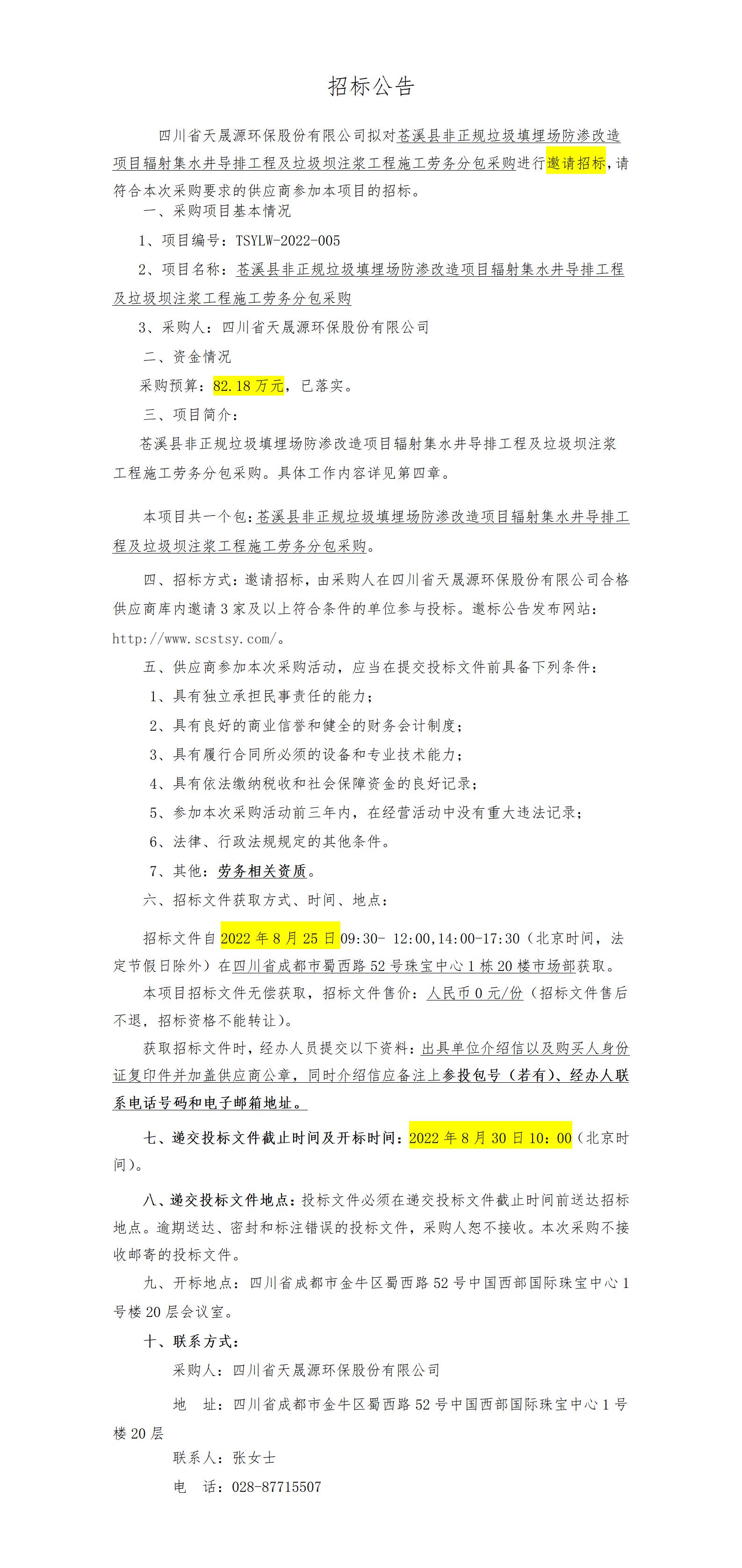 招标公告-苍溪县辐射集水井导排工程及垃圾坝注浆工程施工劳务分包采购 TSYLW-2022-005