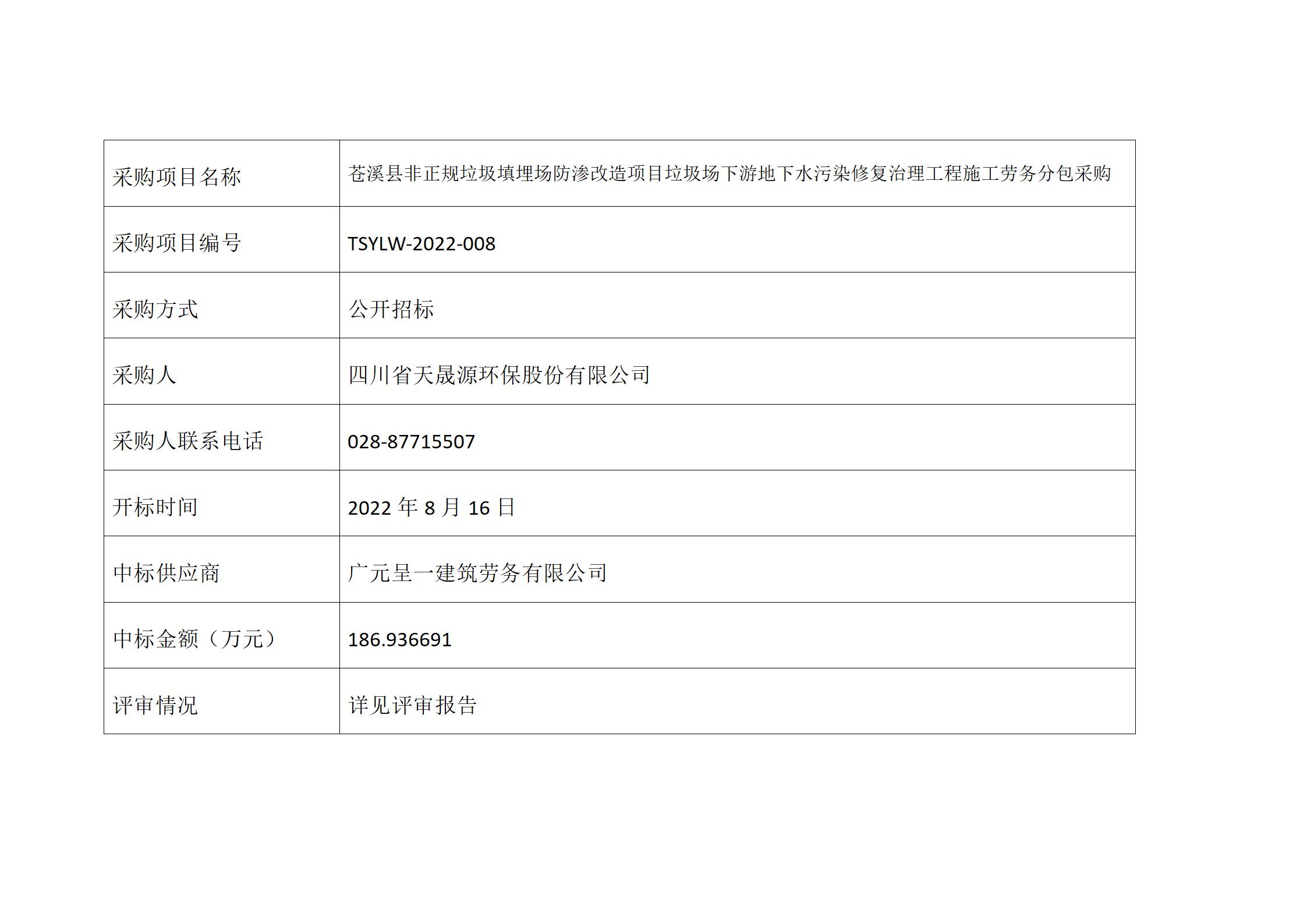 中标公告-苍溪县非正规垃圾填埋场防渗改造项目垃圾场下游地下水污染修复治理工程施工劳务分包采购TSYLW-2022-008