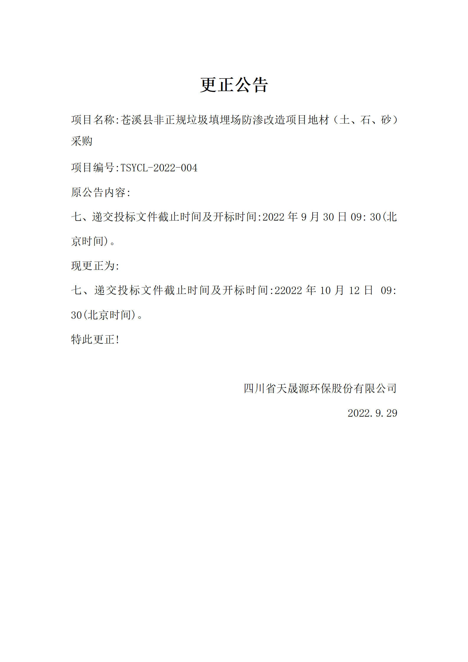 更正公告-苍溪县非正规垃圾填埋场防渗改造项目地材(土、石、砂)采购