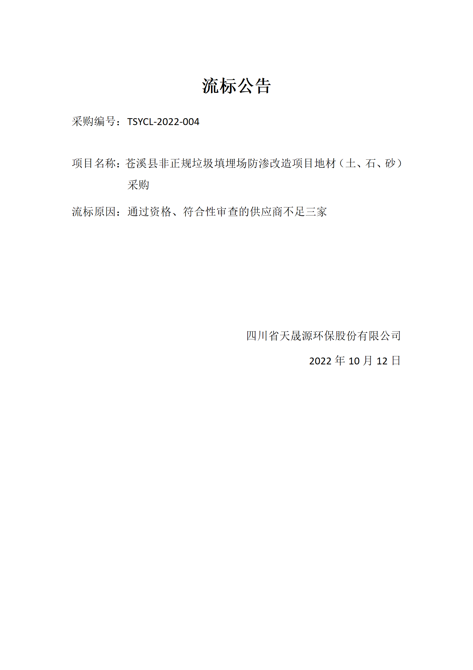流标公告-苍溪县非正规垃圾填埋场防渗改造项目地材(土、石、砂)采购
