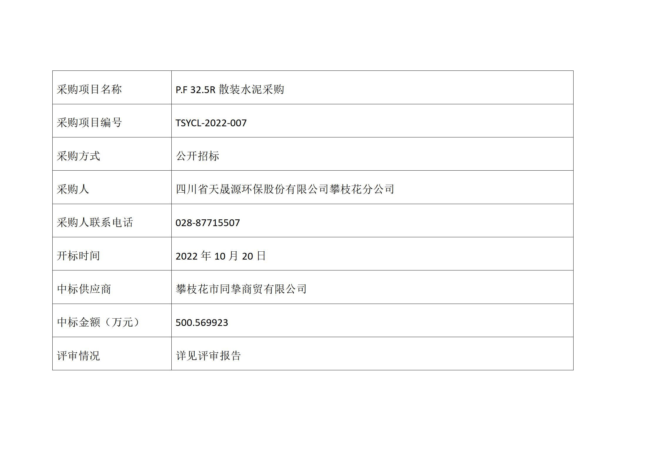 中标公告- P.F 32.5R散装水泥采购TSYCL-2022-007