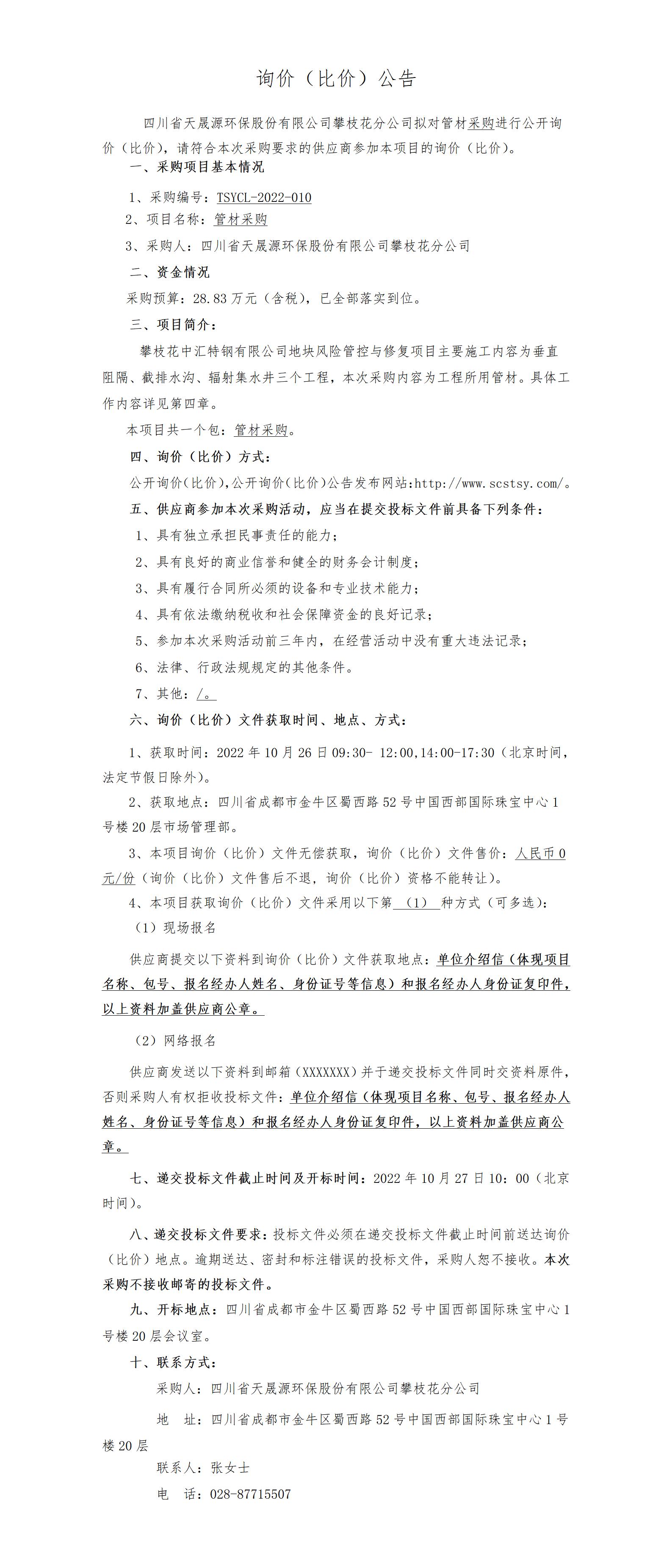 TSYCL-2022-010 询价(比价)公告-管材采购