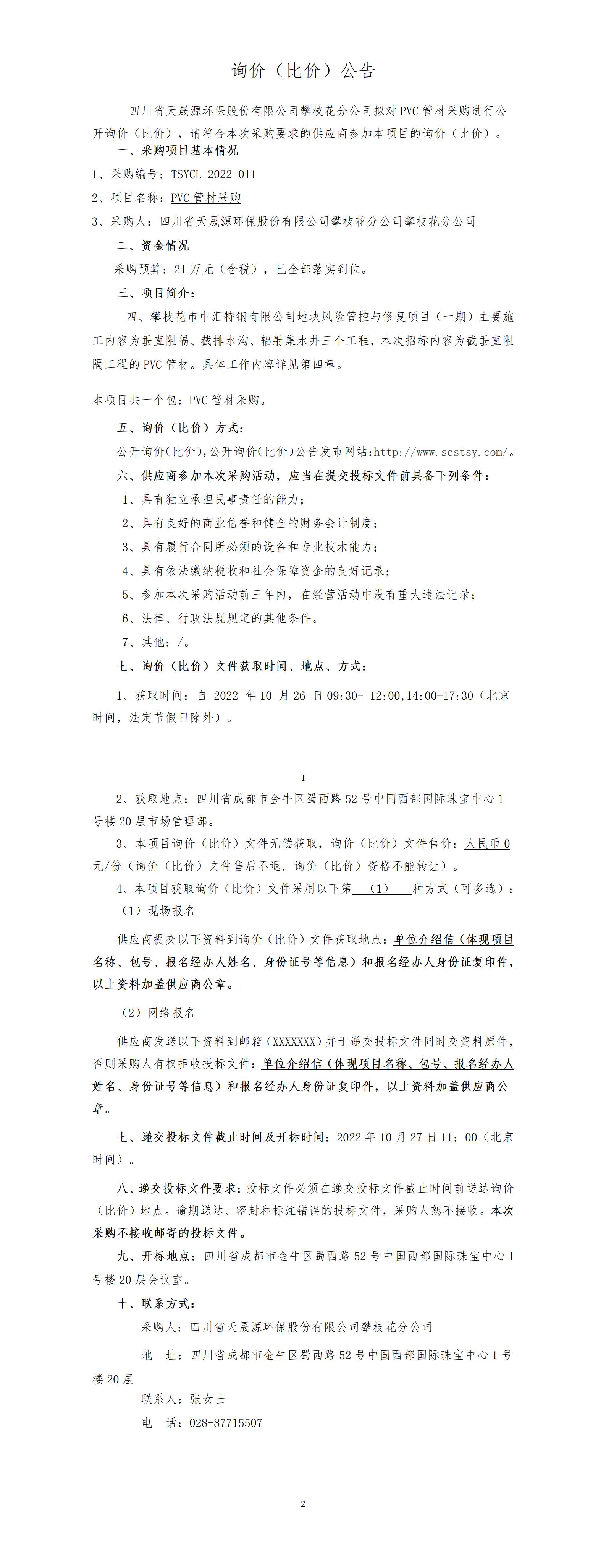 TSYCL-2022-011 PVC管材公开询价(比价)公告