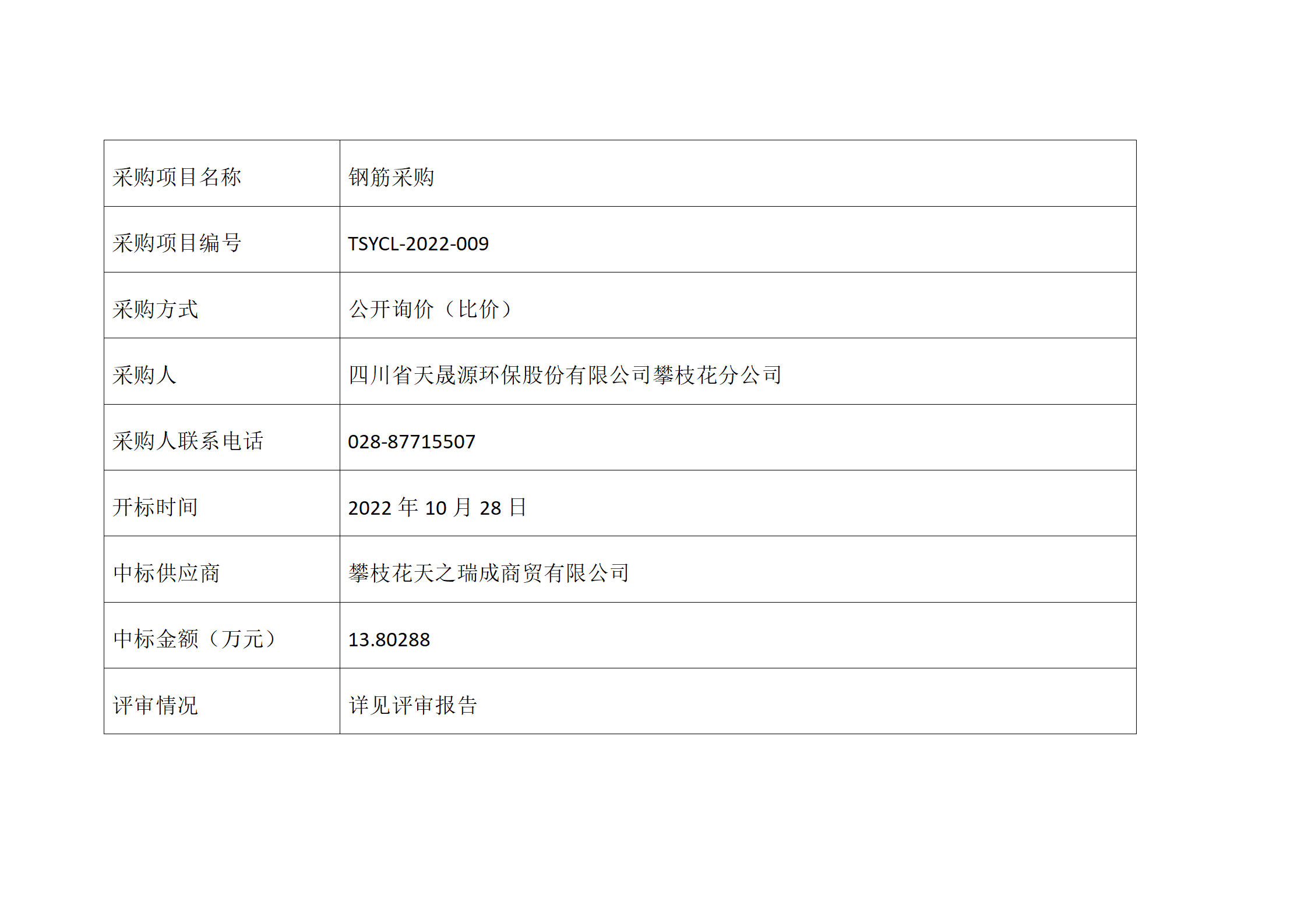 中选公告-钢筋采购tsycl-2022-009