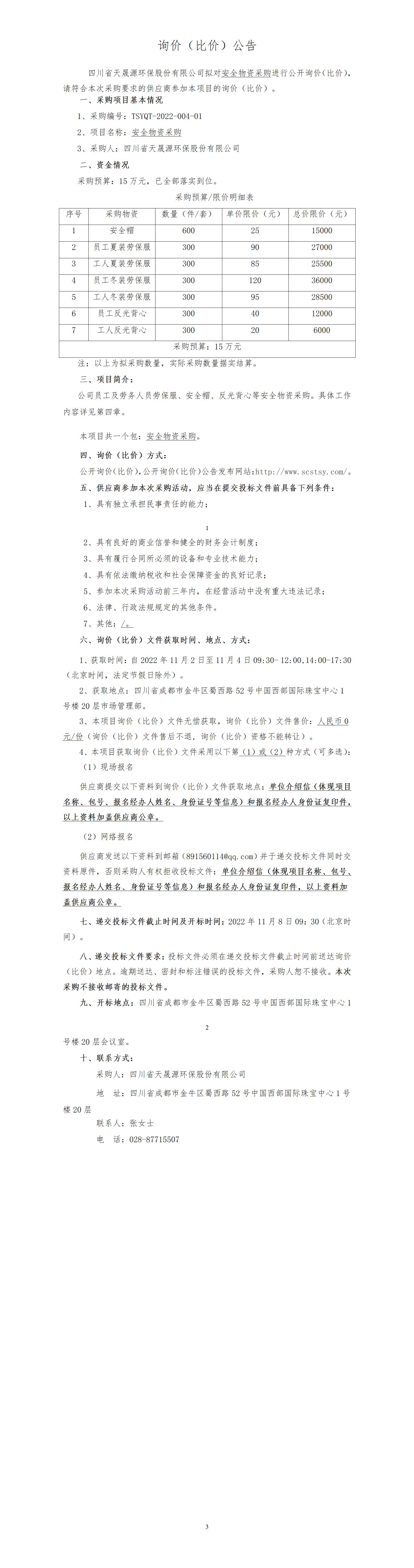 TSYQT-2022-004-01 安全物资采购-公开询价(比价)公告(第二次)