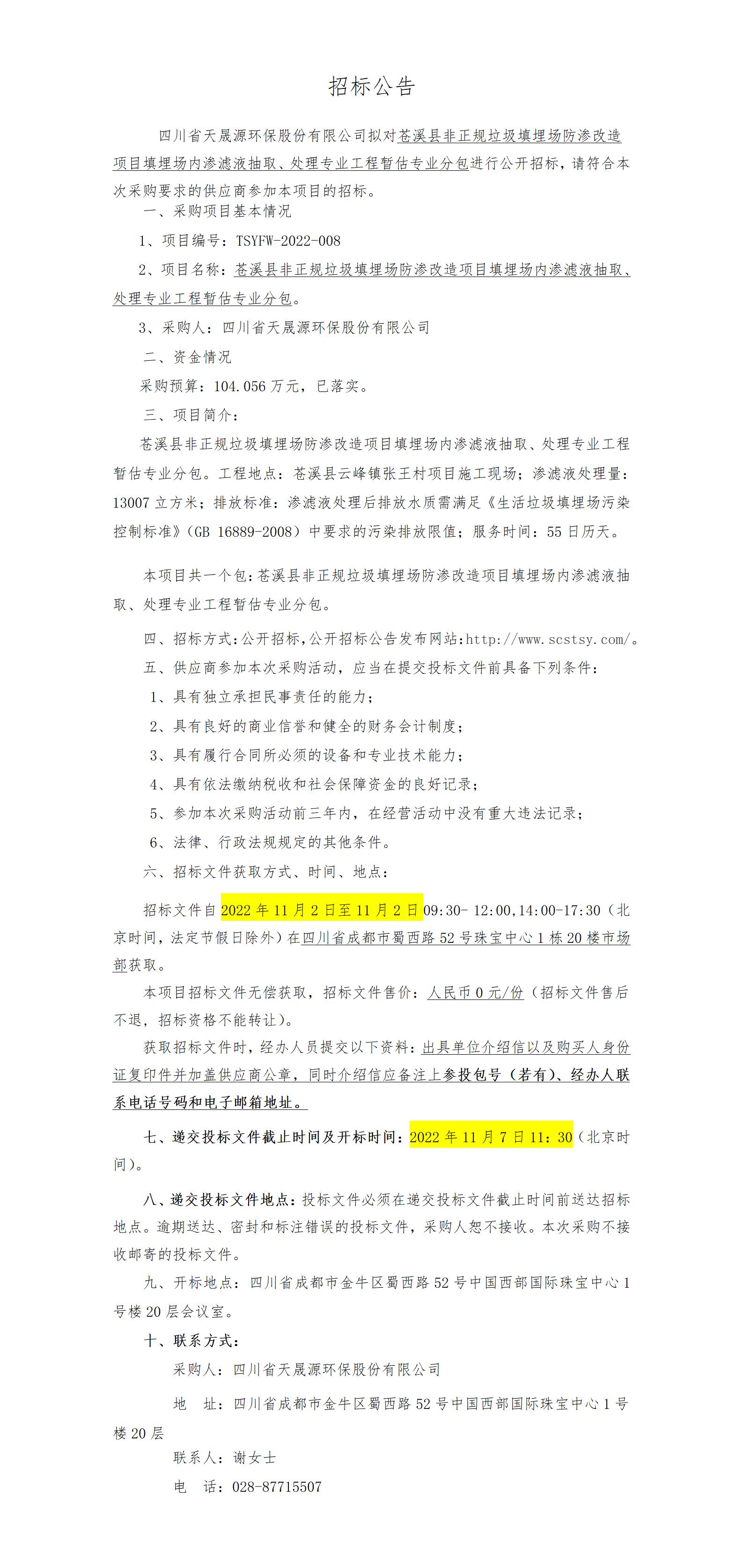招标公告-苍溪县非正规垃圾填埋场防渗改造项目填埋场内渗滤液抽取、处理专业工程暂估专业分包