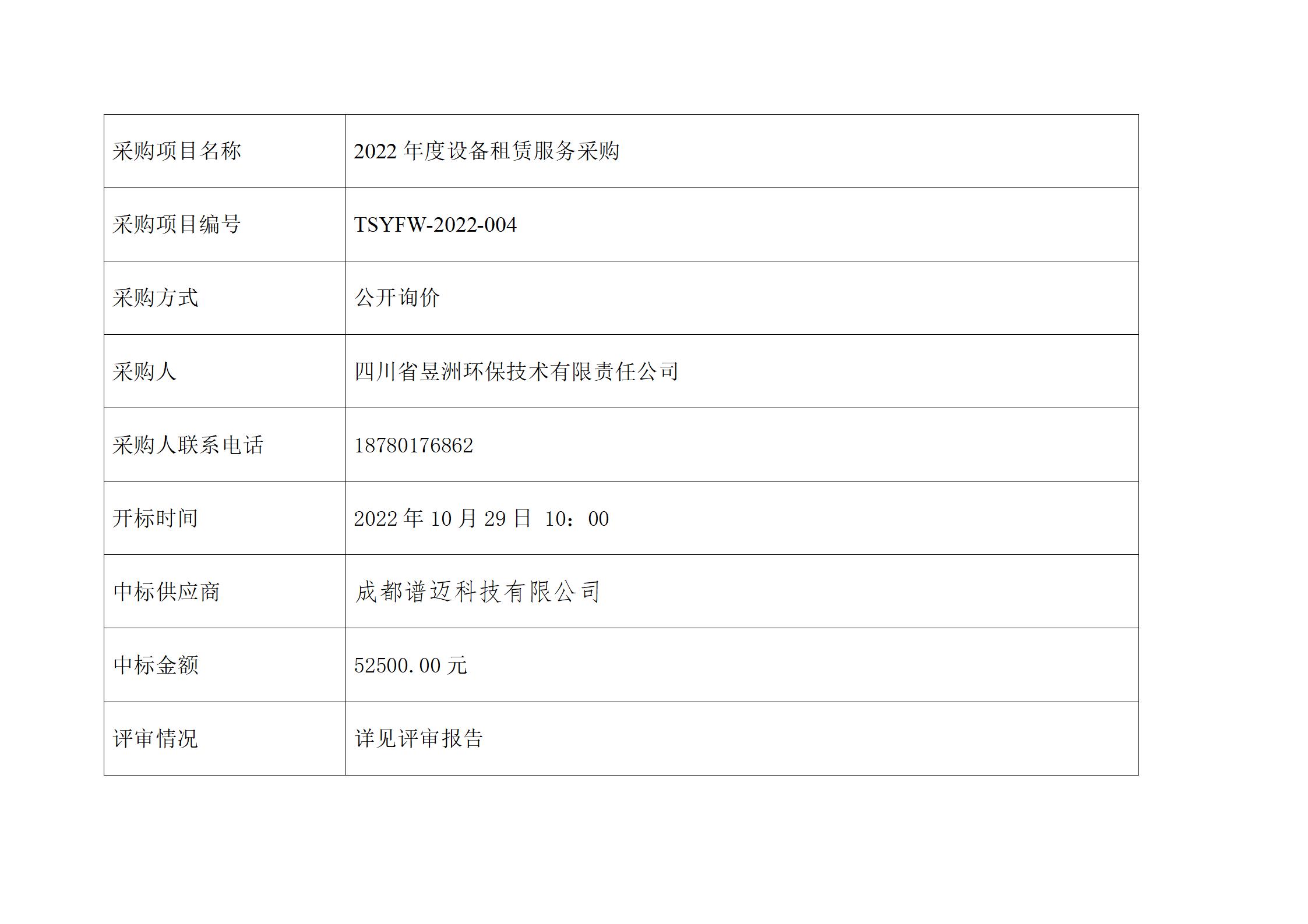 中选结果公示表-2022年度设备租赁采购