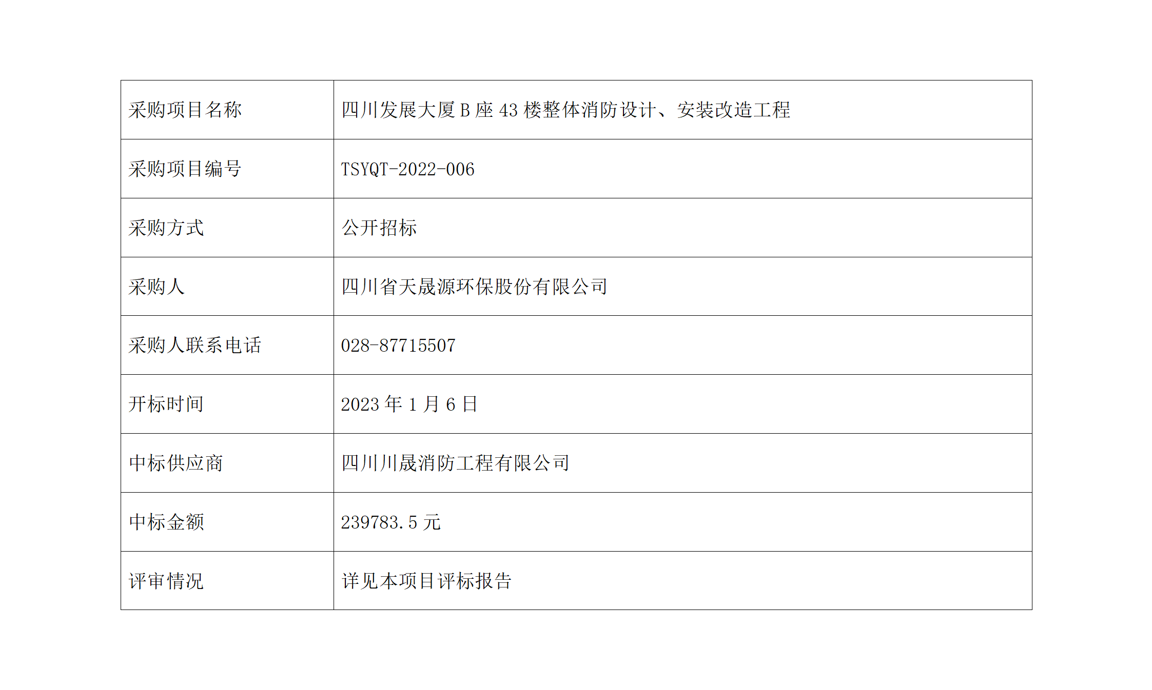 中标公告-四川发展大厦B座43楼整体消防设计、安装改造工程采购