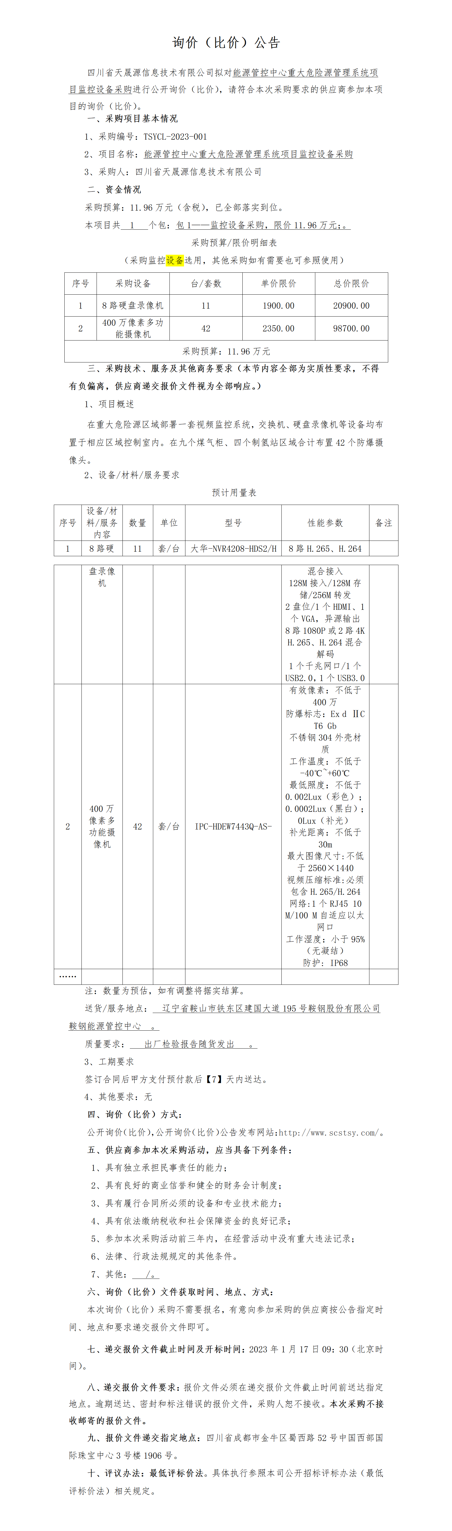 能源管控中心重大危险源管理系统项目监控设备采购-公开询价比价公告