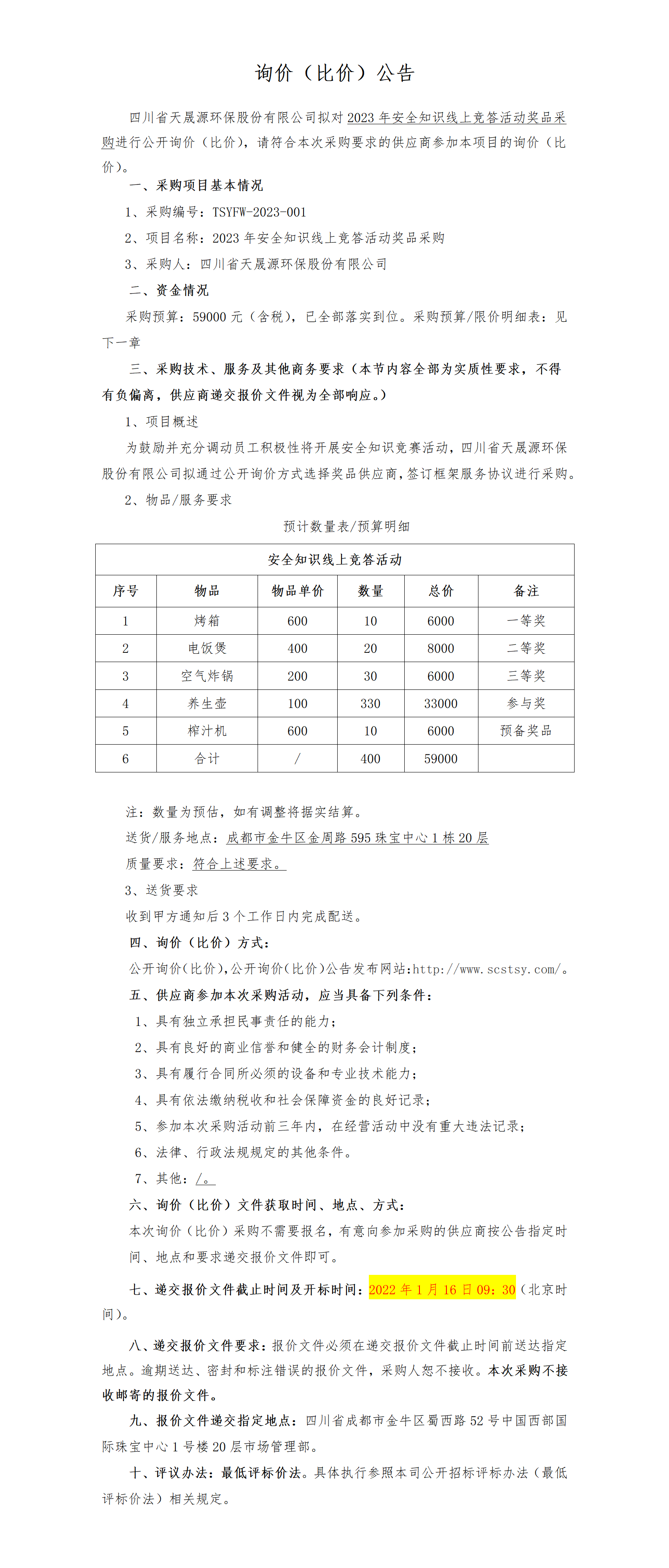2023年安全知识线上竞答活动奖品-公开询价比价公告