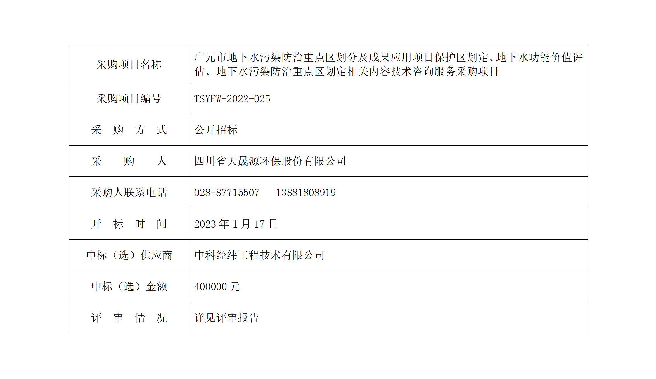 中标公告-广元市地下水污染防治重点区划分及成果应用项目保护区划定、地下水功能价值评估、地下水污染防治重点区划定相关内容技术咨询服务采购