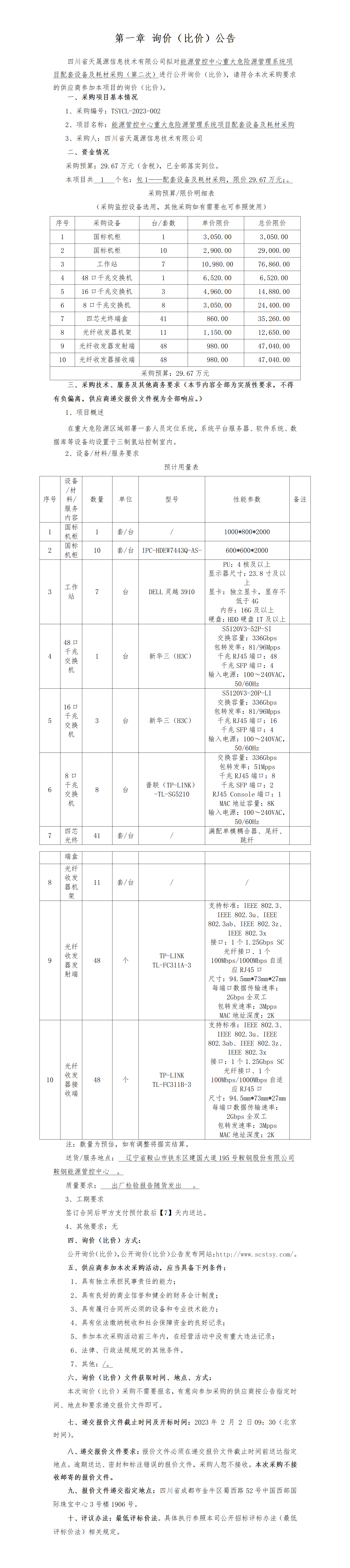 能源管控中心重大危险源管理系统项目配套设备及耗材采购-公开询价比价公告(第二次)