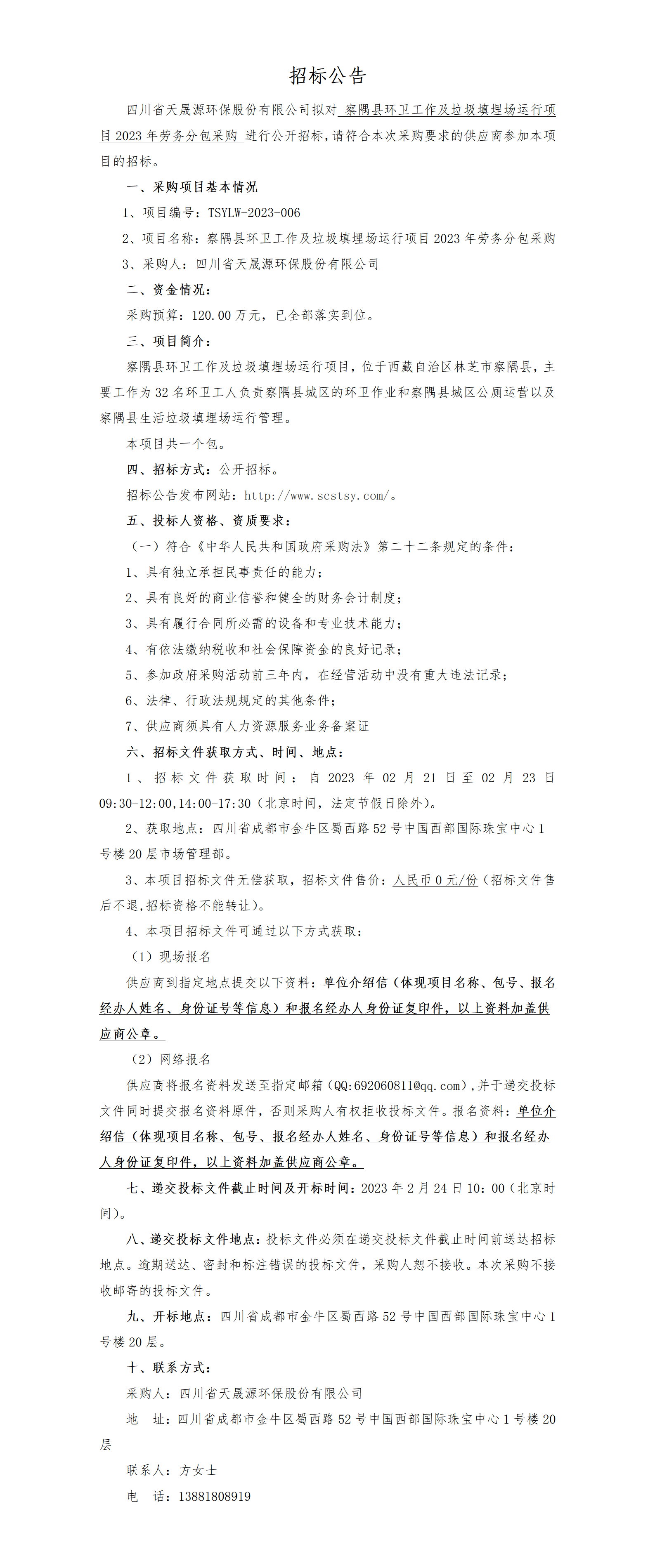 察隅县环卫工作及垃圾填埋场运行项目2023年劳务分包-招标公告
