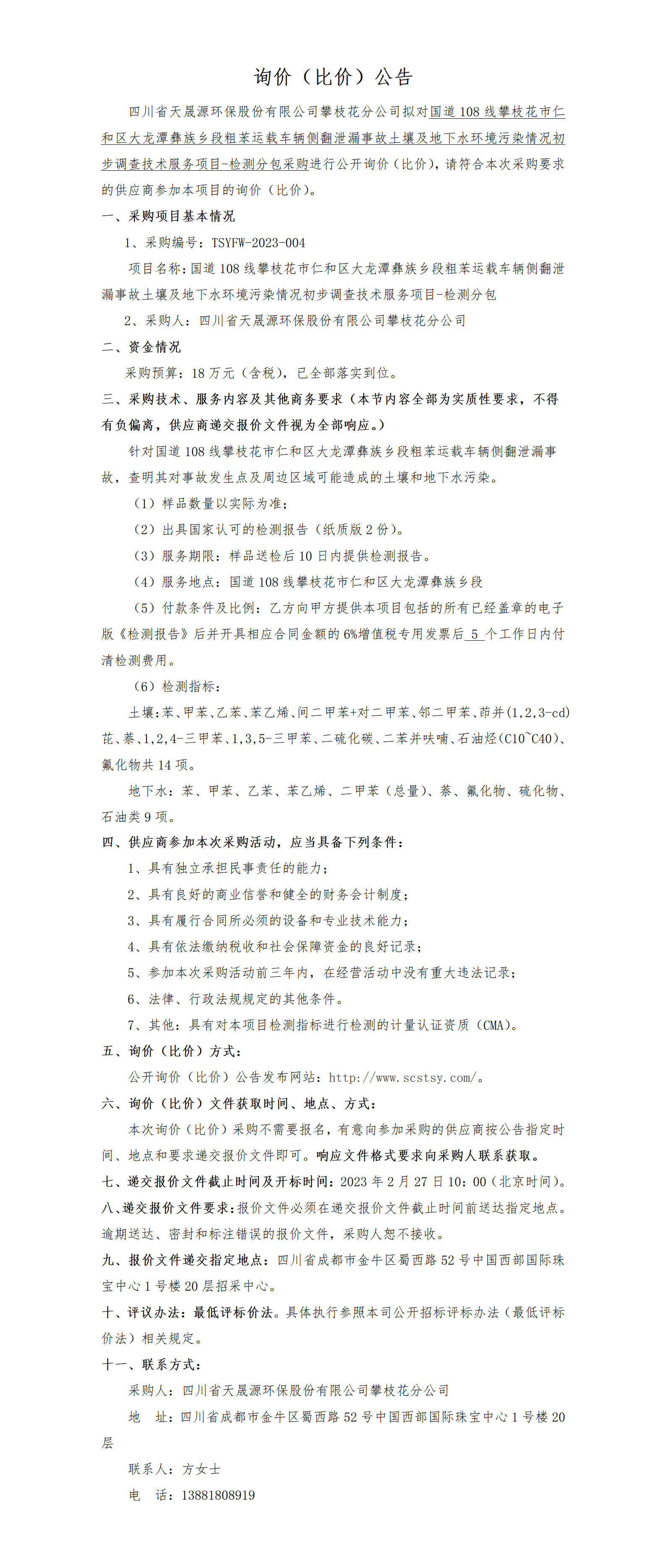 国道108线攀枝花市仁和区大龙潭彝族乡段粗苯运载车辆侧翻泄漏事故土壤及地下水环境污染情况初步调查技术服务项目检测分包