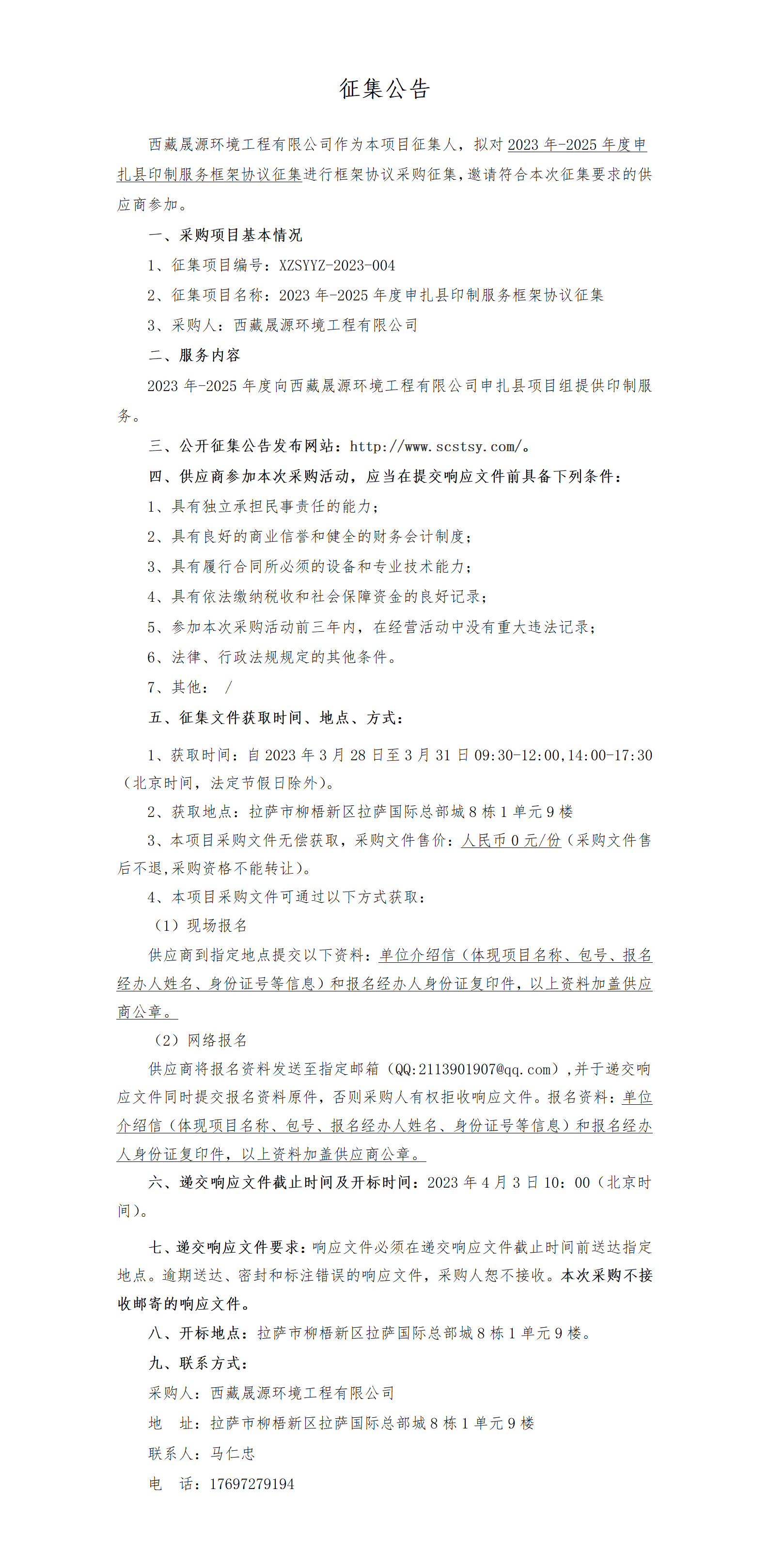 2023年-2025年度申扎县印制服务框架协议征集公告