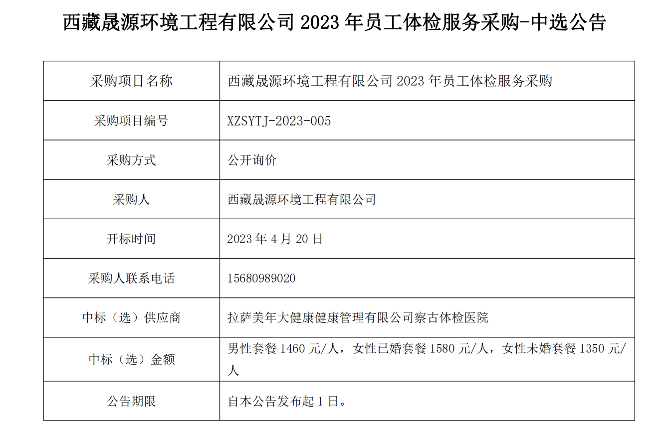 中选公告-西藏晟源环境工程有限公司2023年员工体检服务采购