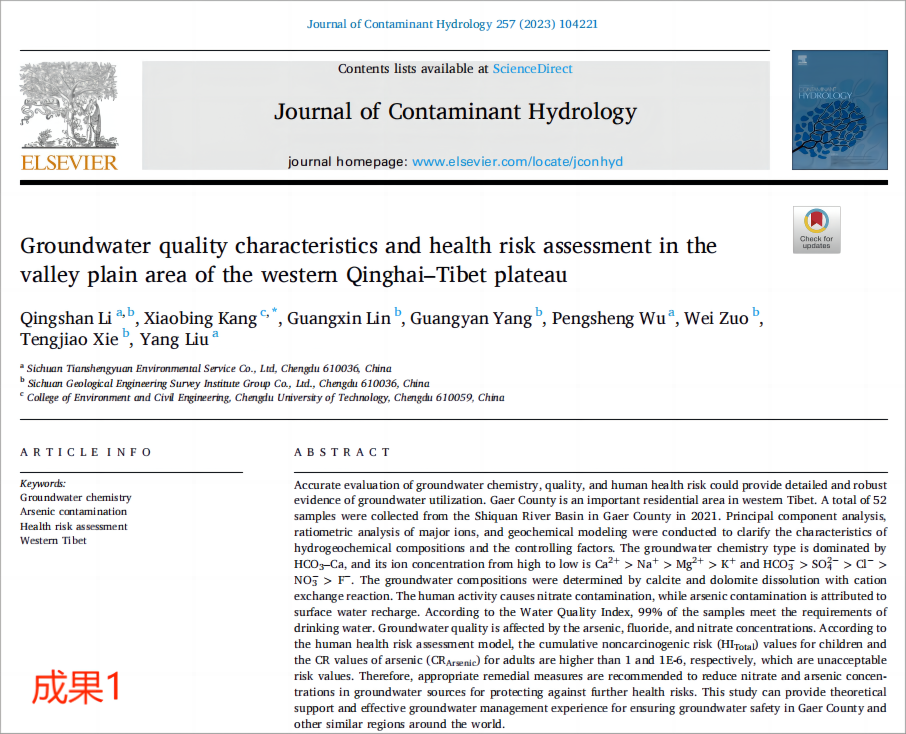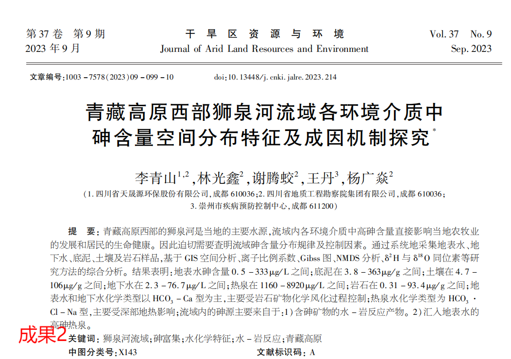 其中成果论文一“Groundwater quality characteristics and health risk assessment in the valley plain area of the western Qinghai–Tibet plateau”已在环境领域国际知名期刊《Journal of Contaminant Hydrology》(IF=4.18)在线发表(https://doi.org/10.1016/j.jconhyd.2023.104221),论文成果二“青藏高原西部狮泉河流域各环境介质中砷含量空间分布特征及成因机制探究”已在环境领域国内知名期刊《干旱区资源与环境》(IF=3.76)发表(10.13448/j.cnki.jalre.2023.214),李青山均为第一作者。
