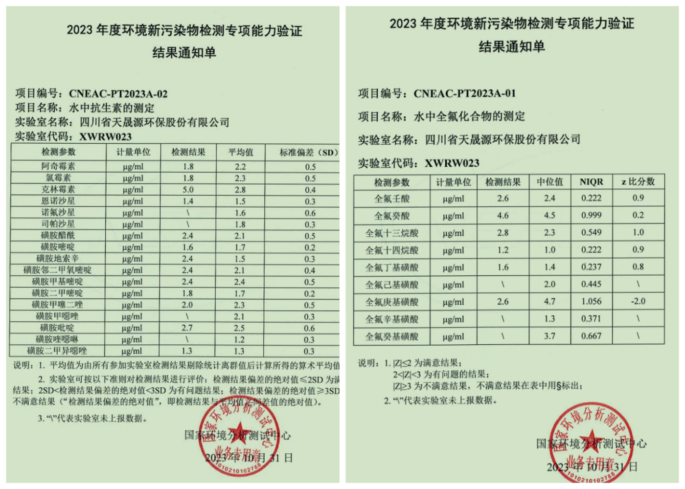 近日,火狐(中国)官方网站-登录入口(以下简称“天晟源环保”)以优异的成绩顺利通过了生态环境部国家环境分析测试中心组织的“2023年度环境新污染物专项能力验证”,本次能力验证项目主要包括水中全氟化合物和抗生素。