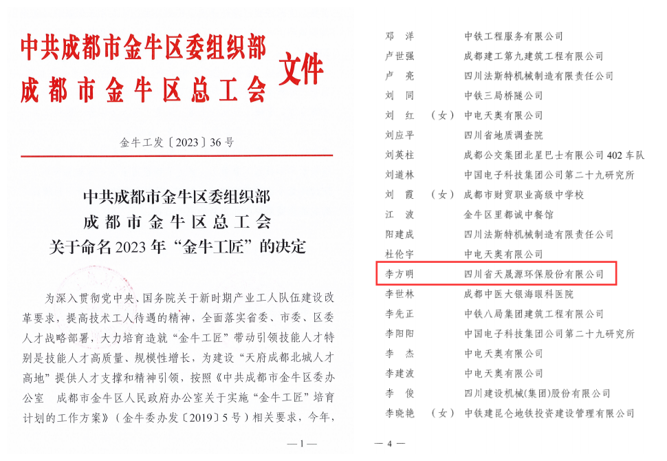 近日,中共成都市金牛区委组织部成都市金牛区总工会发布《关于命名2023年“金牛工匠”的决定》(金牛工发〔2023 ] 36号),火狐(中国)官方网站-登录入口(简称“天晟源环保”)李方明荣获“金牛工匠”荣誉称号。