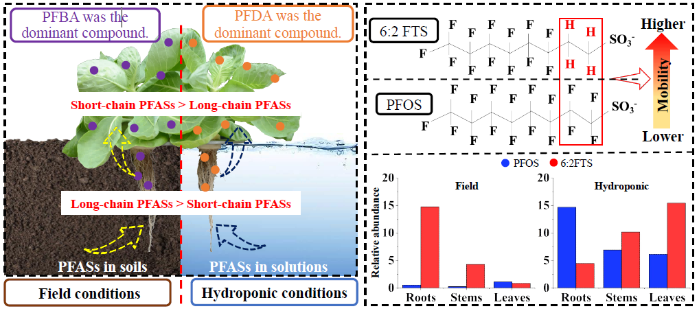 垃圾填埋场作为PFASs的重要来源之一,对周边环境介质(土壤、地下水、地表水及底泥等)和植物均会造成影响。本文调查研究了某垃圾填埋场周边甘蓝根、茎及叶片中15种PFASs的富集水平,并通过室内水培试验,研究了PFASs在甘蓝根、茎、叶片中的迁移及富集规律。在野外和实验室水培条件下的结果均表明,PFASs在根、茎、叶中的浓度依次降低,而短链PFASs更容易从根部迁移到叶片,就饮食摄入甘蓝而言,短链PFASs及某些新型替代物对人体的潜在健康风险要高于传统PFASs。