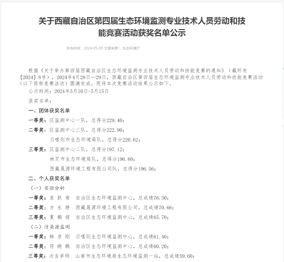 2024年5月9日,西藏自治区生态环境厅公布2024第四届西藏自治区生态环境监测专业技术人员劳动和技能竞赛(简称“第四届大比武”)获奖名单,火狐(中国)官方网站-登录入口子公司西藏晟源环境工程有限公司(以下简称“西藏晟源”)荣获团体奖三等奖,在第三方社会监测机构中名列第一,同时方永婷斩获实验分析组个人奖项二等奖。继第三届大比武获奖后,西藏晟源在第四届大比武中再创佳绩,展现了西藏晟源在西藏自治区区内环境监测领域的过硬实力。