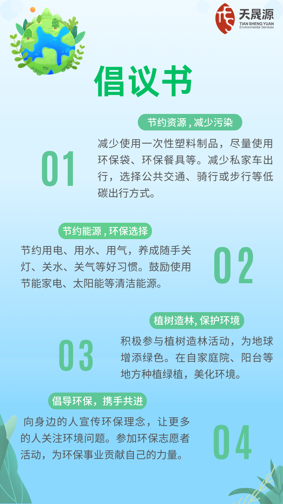 保护环境不仅是企业的责任,更是个人的责任,值此世界环境日之际,天晟源环保向全体员工及广大公众发出呼吁,从小事做起、从日常做起,共同为环境保护贡献一份力量。具体倡议如下: