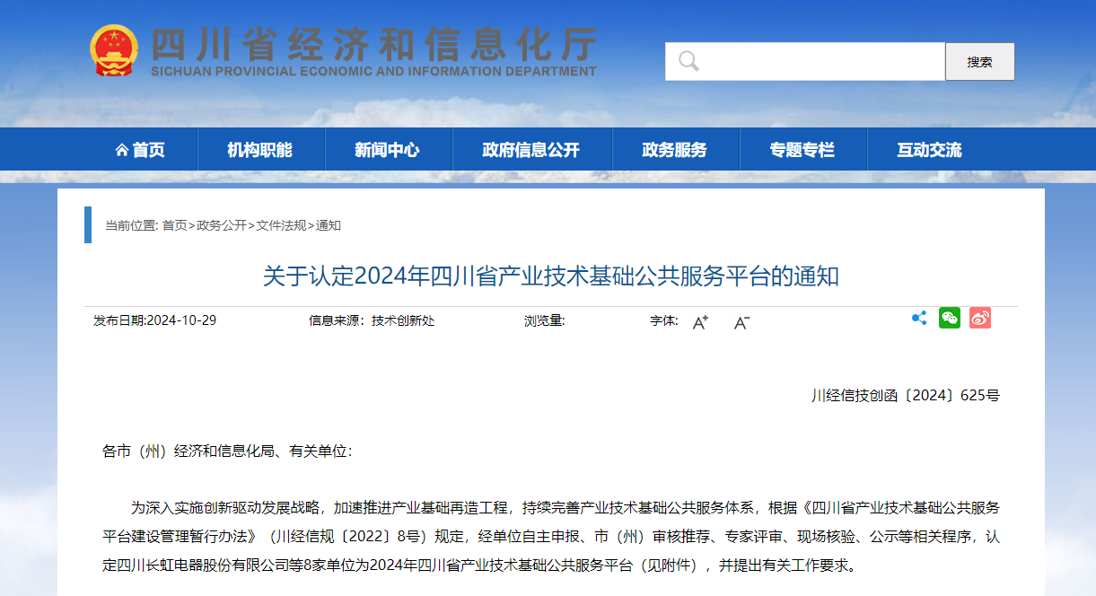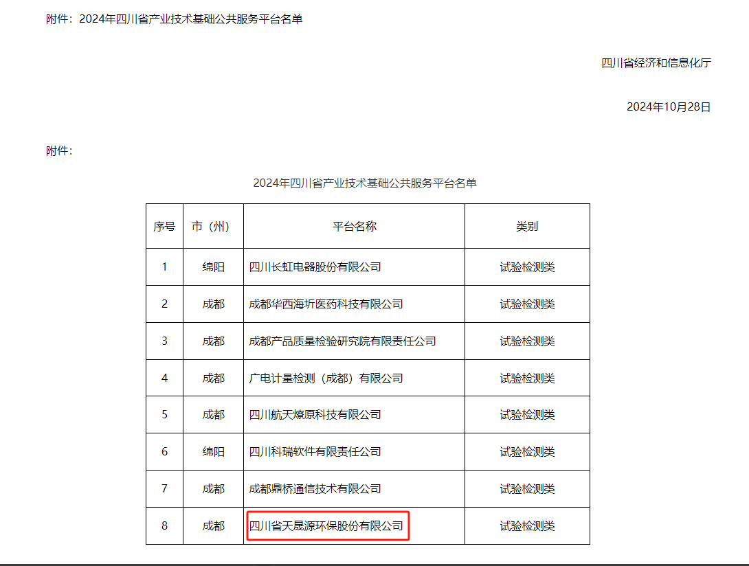 近日,四川省经济和信息化厅发布2024年四川省产业技术基础公共服务平台认定名单,火狐(中国)官方网站-登录入口(简称“天晟源环保”)荣誉入选,成为本次通过认定的八家单位之一。